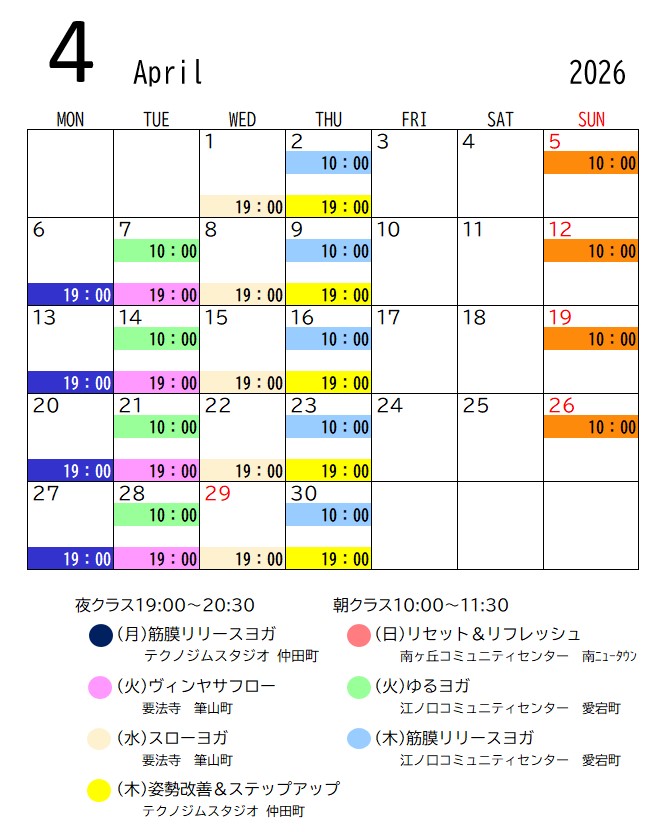 月曜19時 (祝祭日15時) テクノ 筋膜火曜10時 江ノ口 ゆるB火曜19時 要法寺 ヴィンヤサ水曜19時 要法寺 スロー木曜10時 江ノ口 筋膜木曜19時 テクノ ステップアップ日曜10時 南ヶ丘 リフレッシュ